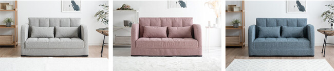ソファベッド『FLATY』の新色「グレージュ」「コーラルピンク」「インディゴブルー」はいずれも“ニュアンスカラー”で、派手過ぎず上品でおしゃれなお部屋に合わせやすいアイテムとなりました。