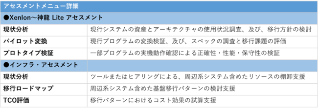 「脱COBOLアセスメントキャンペーン」では、「Xenlon~神龍 Lite」のアセスメントとAWSを活用したクラウド基盤への移行検討を支援する「インフラ・アセスメント」をセットで提供します。