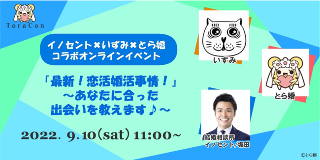 アニメや漫画・ゲームなど趣味をこよなく愛するオタク層向けに特化した結婚相談サービスとら婚は、結婚相談所イノセント、恋愛相談ブロガーいずみさんとのコラボによる「オンライン婚活トークイベント」を、2022年9月10日(土)に開催いたします。