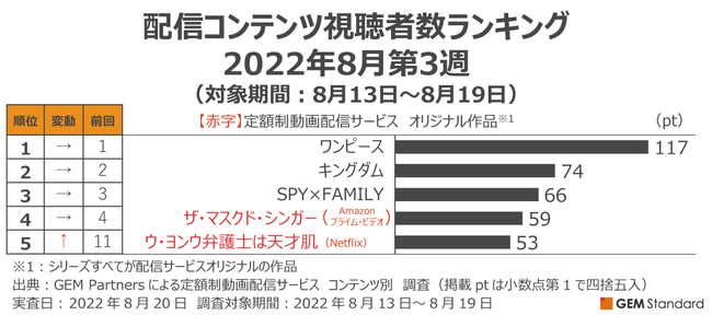 エンタテイメント業界に向けたデータ×デジタルマーケティングサービスを提供するGEM Partners株式会社(ジェムパートナーズ、所在地:東京都港区、代表取締役:梅津文)は8月25日(木)、複数の定額制動画配信サービスを横断して集計した2022年8月第3週の「配信サービス視聴者数ランキング(調査対象期間:8月13日~8月19日、調査対象:日本在住15~69歳男女)」を発表します。