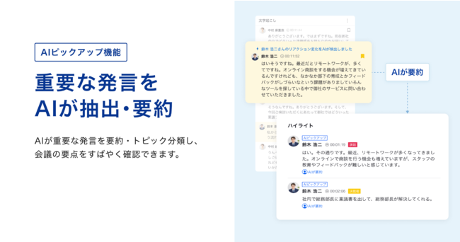今回、重要な発言をAIが抽出し要約する「AIピックアップ」機能をリリースしました。ピックアップされた発言は、「ハイライト」として画面の左側に自動で追加されます。発言内容のカテゴリも表示されるため、会議の重要な部分を簡単に確認することが可能です。会議の参加者以外に共有する際も、よりスピーディーに内容を把握することができるようになります。