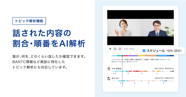 また、加えて会議で話された内容を解析・分類し可視化する機能を追加しました。AIが分類するトピックとしては、商談の振り返りで欠かせないBANTC情報(予算、決裁権、必要性、時期、競合)や、商談以外の会議でも使用できるアイスブレイク、質疑応答、説明、クロージング等があります。各トピックの長さ・割合や話される順番が可視化されることで、他の営業パーソンとの比較や振り返りを効率よく行っていただけるため、営業組織の持続的な成長を支援し様々な業界のセールスイネーブルメントに貢献します。