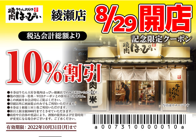 オープン記念として、2022年10月31日(月)まで『牛たん大好き焼肉はっぴぃ綾瀬店』でご利用いただける10%割引クーポンを配布します。