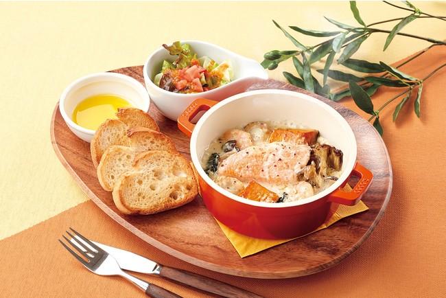 本フェアでは、「より季節感のある商品を食べたい」というお客様の声にお応えし、季節を感じる食材を使用した商品が毎月登場します。9月は厚めにカットした旬な北海道産秋鮭を贅沢に使い、秋の味覚であるきのこを添えた、煮込みプレートとクリームパスタが登場します。鉄板でこんがり香ばしく焼き上げた秋鮭の風味が、秋の訪れを感じさせます。