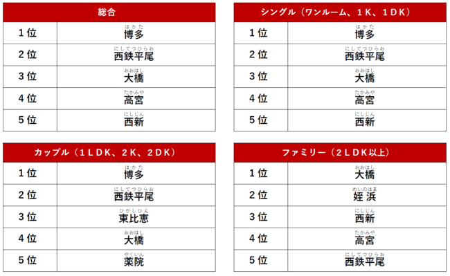 1LDK~2DKのカップル向き物件では、「博多」駅が1位でした。2位は「西鉄平尾」駅、3位は「東比恵」駅が続きました。
