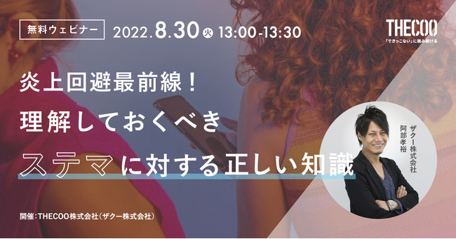 THECOO株式会社(本社:東京都渋谷区、代表取締役CEO:平良真人、証券コード:4255)は、2022年8月30日(火)SNSマーケティング担当者へ向けた炎上や危機管理広報に関するウェビナー「炎上回避最前線!理解しておくべきステマに対する正しい知識」を開催いたします。