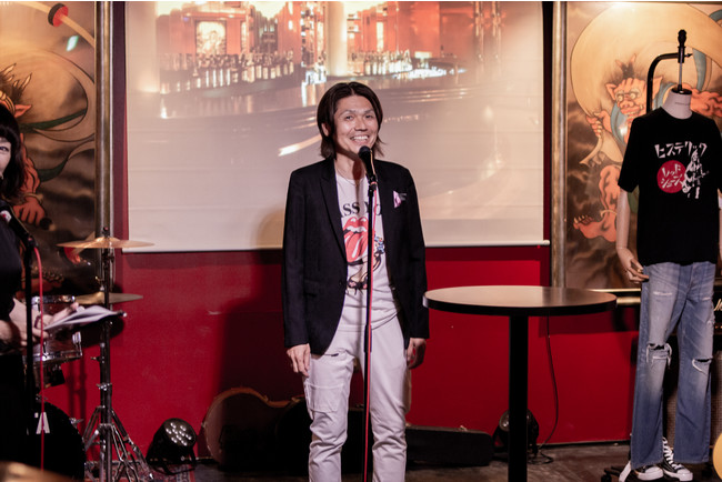 そのほかにも、書籍の発売日に開催される発売記念スペシャルライブ「レッドシューズ40」の情報を解禁し、出演者の一人である奥田民生からのメッセージ映像を紹介。ロックをブランドイメージとするHYSTERIC GLAMOURが手がけるコラボTシャツ、門野氏の故郷である福井県の小浜酒造とのコラボ日本酒の発売と、盛りだくさんの内容が発表され、パーティー終盤には発売記念スペシャルライブにも出演する冷牟田竜之がスペシャルDJとして登場し、会場を盛り上げました。