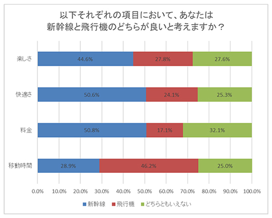 「移動時間」については「飛行機」を選ぶ人が多く、46.2%となっています。それ以外は新幹線の方が、「楽しさ」44.6%、「快適さ」50.6%、「料金」50.8%の割合で高い結果となりました。「料金」については、「どちらともいえない」が32.1%と、かなり高くなっています。