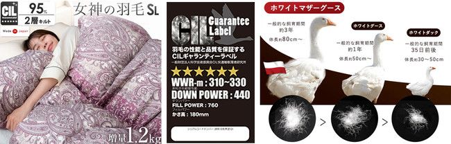 今回のセット商品である羽毛布団は、この「CILギャランティーラベル」のグレーディングにおいてゴールドラベルに認定されており、その品質が保証されています。