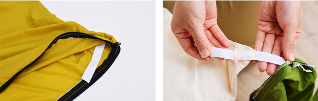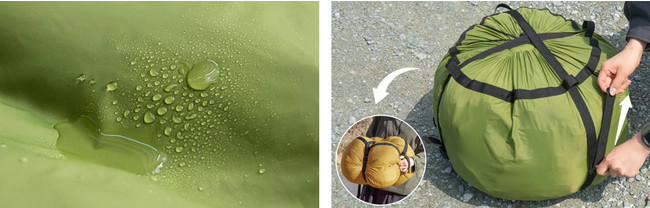 本製品のカバー生地は、アウトドアユースに向けて撥水加工を施しており、結露による水や汚れが内部に染み込むことを防ぎます。また通常のダウンシュラフの洗濯は、非常に気を使うものですが、本製品は、中の羽毛布団を取り出すことで、ご家庭でもお気軽に洗濯することができます。