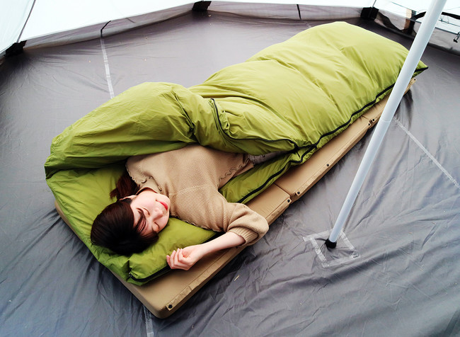 原料となる羽毛の仕入れから手掛ける同社では、今回、ダウンシュラフの開発を企画するにあたり、羽毛(ダウン)の種類、量、ダウン率、ダウンパワー(もしくはフィルパワー)など様々な視点で検討した結果、室内用の羽毛布団を寝袋・ダウンシュラフとして使うことが、もっとも暖かく快適な環境を低コストで実現することができると結論に至りました。