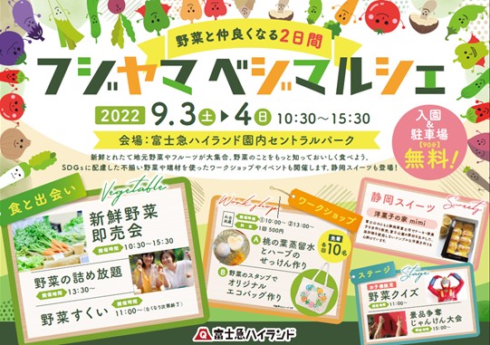 入園無料の富士急ハイランド(山梨県富士吉田市)では、地元の新鮮野菜即売会や野菜を使ったワークショップ体験ができるイベント「フジヤマベジマルシェ」を2022年9月3日(土)・4日(日)に開催いたします。