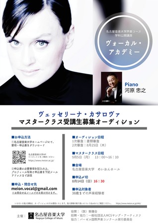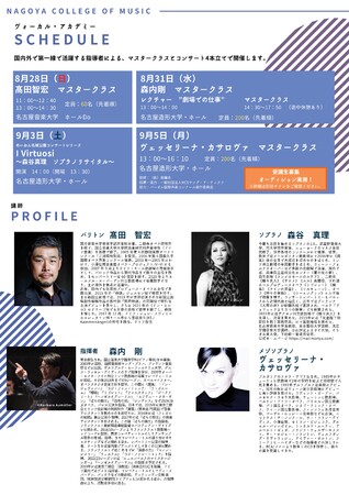 学校法人 同朋学園 名古屋音楽大学では今年度より「ヴォーカル・アカデミー」と称した、国際的に活躍する声楽家や指揮者によるコンサートと公開レッスンを8月28日(日)~9月5日(月)にかけて実施します。