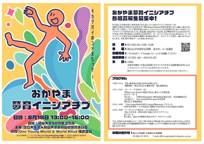 国立大学法人岡山大学(本部:岡山市北区、学長:槇野博史)は2022年8月18日、岡山県教育委員会と協働で、若者が夢を育み、夢に挑戦していく場を提供する「おかやま夢育イニシアチブ」のスタートアップイベントを開催し、県内外の高校生110人が参加しました。