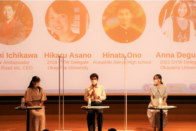 次に、One Young World Japanの大久保公人代表理事から、世界190カ国以上から2,000人以上の若い次世代リーダー達が集まる世界最大級の国際プラットフォームOne Young World(以下、OYW)の紹介があり、自身もOYWに参加し、OYWの取組みを支援しているWorld Road株式会社の市川太一代表取締役CEOがモデレーターを務め、本学のOYWアンバサダーの浅野ひかるさん(教育学部4年生)、出口杏奈さん(文学部4年生)と倉敷青陵高校2年生の小野日向汰さんで、それぞれの夢についてのリレートークを行いました。