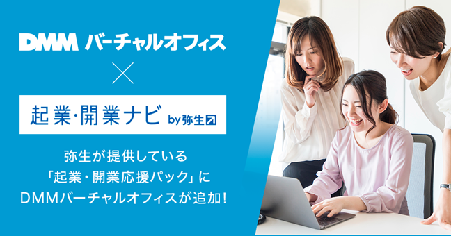 弥生株式会社(本社:東京都千代田区、代表取締役社長:岡本 浩一郎)は同社が運営する「起業・開業ナビ」内の「起業・開業応援パック」に、合同会社DMM.com(本社:東京都港区、会長 兼 CEO 亀山敬司、以下DMM)が展開する「DMMバーチャルオフィス」を新たに追加したことを、お知らせします。
