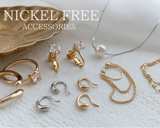 ニッケルフリーアクセサリーは、主な金属アレルギーの原因とされるニッケルをほぼ含まない、肌にやさしい仕上げを施したアクセサリー。