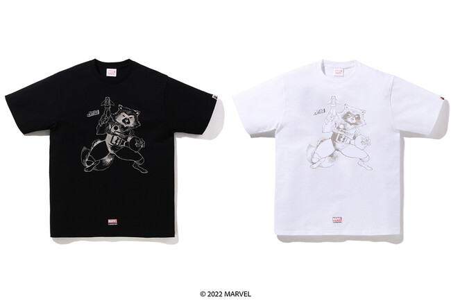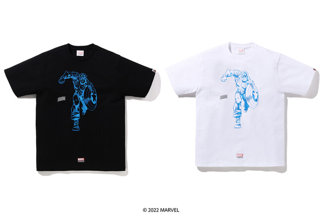 同時リリースとなるTシャツのグラフィックは、キャラクターのアイコニックなシルエットにBAPE(R)︎ CAMOを投影。また、ボディの下部と首裏のタグには、両者の長きにわたるリレーションシップの象徴としてBAPE(R)︎とMARVELのダブルネームロゴを配置しています。