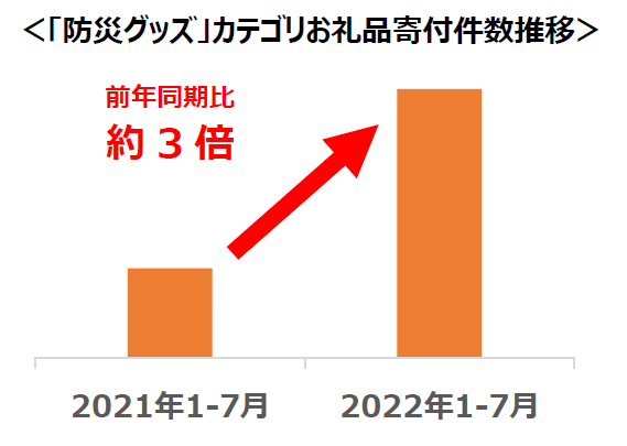 「さとふる」では全国で制作された防災グッズとして活用できるお礼品を掲載しており、「防災グッズ」カテゴリお礼品への寄付件数は、2022年1~7月の寄付件数が前年同期比で約3倍に増加していることがわかりました。いつ起こるか分からない災害・非常事態の備えとしてふるさと納税を活用する方が増えています。