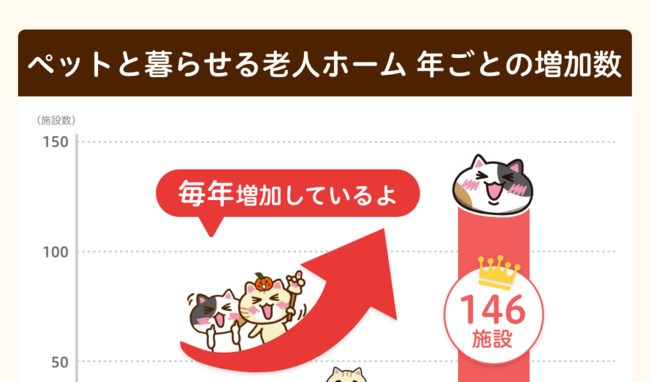 「みんなの介護」掲載施設数をみても、「ペットと暮らせる(ペット・犬・猫可)」の老人ホーム数は増加傾向にあります。2020年は+24件の増加でしたが、2021年には前年比+42件。さらに、2022年は8月現在ですでに前年比+146件の増加となっています。
