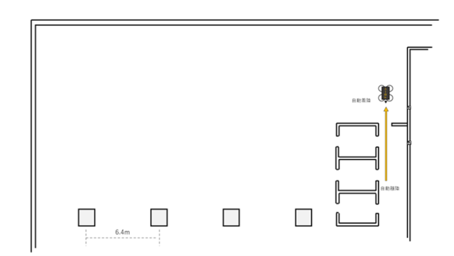 3. ドローン離陸、幅2メートルの通路を飛行後ドア開口部90センチメートルの狭小空間を通過。
