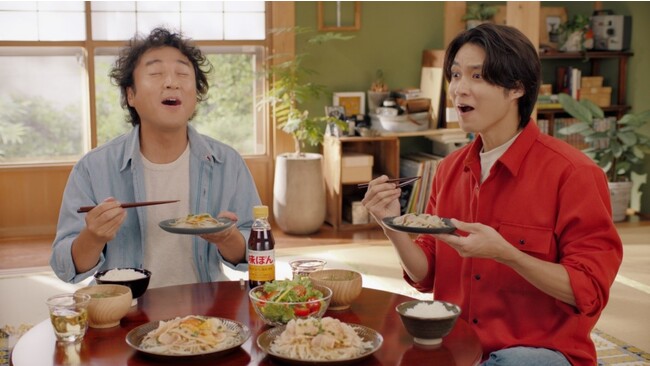 今春からスタートした新コミュニケーションでは、気の置けない仲間が集うムロツヨシさんの部屋を舞台に、ムロさん自ら「味ぽん」を使った絶品メニューと楽しいおしゃべりで来客をもてなし、食卓を囲むしあわせなひと時を描いたCMシリーズを展開。最新作の第2弾では磯村勇斗さんをゲストに迎え、言葉遊びを楽しむ中で、おいしい「豚もやし」が手軽に作れることを伝える『チンしてぽん!』篇をはじめ、豚肉ともやしの相性についてムロさんがうんちくを傾けるも、おいしさの余り、自分の世界に浸る磯村さんに戸惑う『力説』篇、ムロさん自慢の「ぽん餃子(=味ぽんで食べる餃子)」を食べた瞬間、二人のリアクションが被ってしまう『ジュワジュワ』篇の3篇を制作しました。お互いの相性を「100点満点(ムロさん)」「120点(磯村さん)」と評した二人が、味ぽんを使った「ぽん餃子」や「豚もやし」のおいしさと手軽さを、それぞれ独特の表現でコミカルにアピールしていく、和気あいあいとした掛け合いにご注目ください。