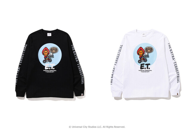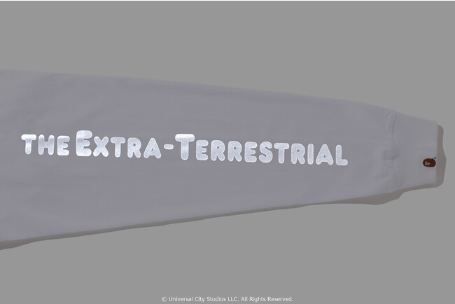 エリオットが自転車のカゴに「E.T.」を乗せて満月の夜空に旅立つシーンを切り取ったグラフィックは、APE HEADを光り輝く満月に見立てたスペシャルデザイン。また、スウェットの袖リブ上部には、感動のラストシーンよりE.T.の別れの言葉「I’ll…be…right..here.(ボクハ ココニ イルヨ)のメッセージをプリントするなど、『E.T.』の名場面・名セリフをBAPE(R)︎らしいアプローチでフィーチャーします。