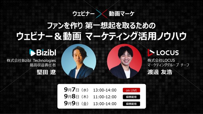 株式会社Bizibl Technologies(本社:大阪市北区、代表取締役:花谷燿平、以下Bizibl)と株式会社LOCUS(本社:東京都渋谷区、代表取締役:瀧良太、以下LOCUS)が 「ファンを作り 第一想起を取るための ウェビナー&動画 マーケティング活用ノウハウ」 と題したウェビナーを9月7,8,9日に連日開催いたします。