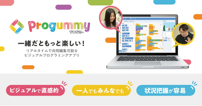 「プログミー」は、複数人で同時に編集できる共同編集機能を業界で初めて[*1]搭載した、ビジュアルプログラミングアプリ(Webアプリケーション)です。複数人でリアルタイムにプログラミングを行い、完成したプログラムやゲームは皆で遊ぶこともできます。画面上でブロックを組み合わせるようにしてプログラミングを行うため、特定の言語に縛られず、プログラミングの基本となる考え方を楽しく学べます。