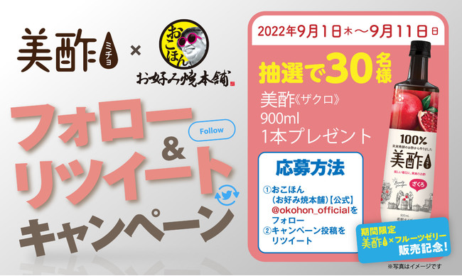 秋期間限定メニュー「美酢×フルーツゼリー」の販売を記念して、SNSでのプレゼントキャンペーンを開催いたします。ご応募は『おこほん』公式Twitterアカウントをフォローし、キャンペーン投稿をリツイートするだけ!ぜひお気軽にご参加ください。