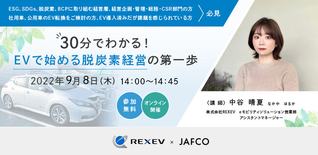 e-モビリティで脱炭素社会を目指すEnergy Tech企業の株式会社REXEV(東京都千代田区、代表取締役社長:渡部 健)は、 無料ウェビナー「30分でわかる!EVで始める脱炭素経営の第一歩」を2022年9月8日(木)に開催します。
