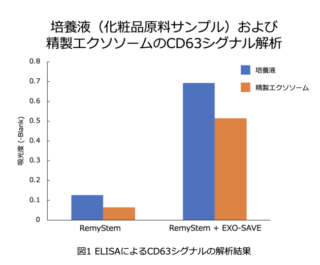 EXO-SAVE は、培地の成分調整を行うことで、エクソソームや成長因子が容器に付着することを防止し、凍結によるタンパク質の破壊もある程度抑制することができる。通常のヒト幹細胞培養液『RemyStem』に EXO-SAVE を用いると、エクソソームの含有量は約 7 倍にもなる。他社製品も含めて、リポソームなどの成分保護の加工をしていないヒト幹細胞培養液原料は、容器への付着などによって 80%程度のエクソソームや成長因子をロスしていたことになる。これは容器を移し替えるたびに起こるので、原料を移し替えることで、8割ずつ機能性成分を失う可能性がある。EXO-SAVE は最低限の加工で、機能性成分を約 7 倍にする。同じ配合量であればより強い体感の化粧品を作ることを可能にする原料だ。
