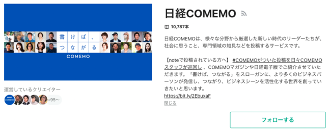 日経COMEMOは、各界のキーオピニオンリーダー約80名が、日経ニュースを起点に知見を投稿するnote上のマガジンです。フォロワー総数は約40万。新聞に馴染みのない若年層と接点を持つために、2017年から開始した日経初のソーシャルサービスです。