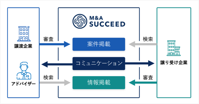 「M&Aサクシード」は、譲渡企業と譲り受け企業をオンライン上でつなぐ法人・審査制M&Aマッチングサイトです。譲渡企業は「M&Aサクシード」に会社や事業の概要を匿名で登録でき、譲り受け企業はその情報を検索して閲覧できます。譲り受け企業は興味を持った譲渡企業へ直接アプローチできるため、譲渡企業にとっては、潜在的な資本提携先の存在や、自社の市場価値を把握するきっかけになります。これにより、譲渡企業は経営の選択肢の一つとしてM&Aを早期から検討でき、経営者の選択肢が広がります。2017年11月にサービスを開始し、全国の譲渡案件が累計12,200件以上(掲載中4,600件以上)登録され、利用中の譲り受け企業は8,000社以上です(2022年5月時点)。URL:https://ma-succeed.jp/