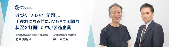 Visionalグループの株式会社M&Aサクシード(所在地:東京都渋谷区/代表取締役社長:金 蓮実)が運営する法人・審査制M&Aマッチングサイト「M&Aサクシード」(https://ma-succeed.jp/)を通じて、三陽工業株式会社(所在地:兵庫県、略称:三陽工業)が、鉄道車両部品等の製造を手掛ける株式会社太田工業所(所在地:愛知県、略称:太田工業所)の全株式を取得したことをお知らせします。太田工業所は三陽工業グループに入ったことで、すでにシナジー効果が出ています。本事例は、製造業の54%が後継者未定(2021年)(注1)という状況のなか、全国の町工場の技術を承継する革新的なモデルといえます。このたび、二社の対談を公開しました。詳細に関してはこちらをご参照ください。