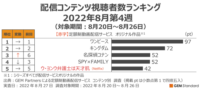 エンタテイメント業界に向けたデータ×デジタルマーケティングサービスを提供するGEM Partners株式会社(ジェムパートナーズ、所在地:東京都港区、代表取締役:梅津文)は9月1日(木)、複数の定額制動画配信サービスを横断して集計した2022年8月第4週の「配信サービス視聴者数ランキング(調査対象期間:8月20日~8月26日、調査対象:日本在住15~69歳男女)」を発表します。