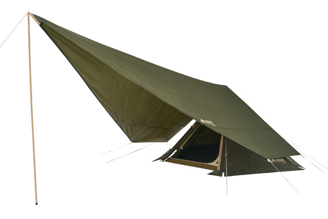 ワンポールテントとの連結に最適なタープ。別売りのポールと組み合わせてマルチに使える。
