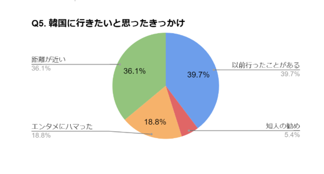 「韓国に行きたいと思ったきっかけ」について、以前行ったことがあるが39.7%、距離が近いが36.1%、エンタメ(ドラマやアイドルなど)にハマったが18.8%、知人の勧めが5.4%という結果になりました。