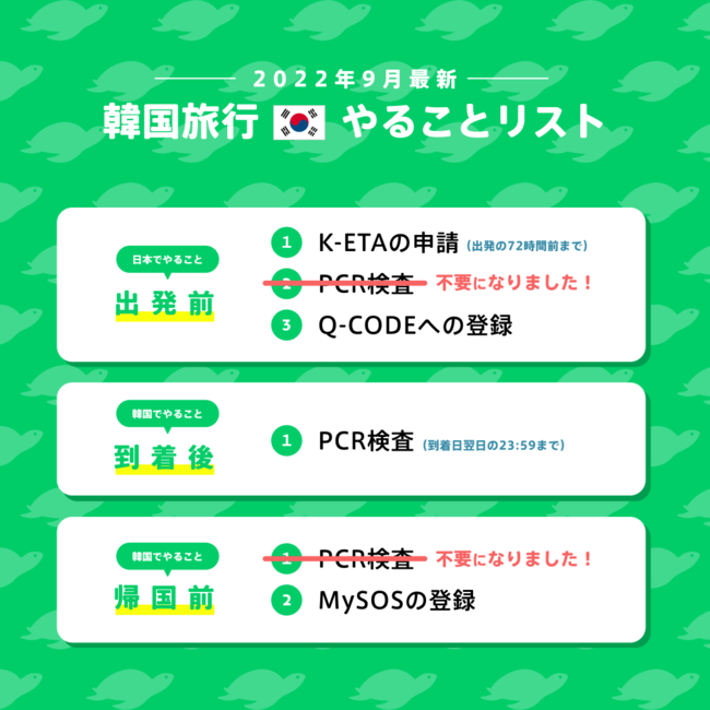 ※ 調査結果は8月22日時点のものです。韓国政府の入国前PCR検査の廃止、日本政府の帰国前条件つきPCR検査の不要発表前の結果となります。