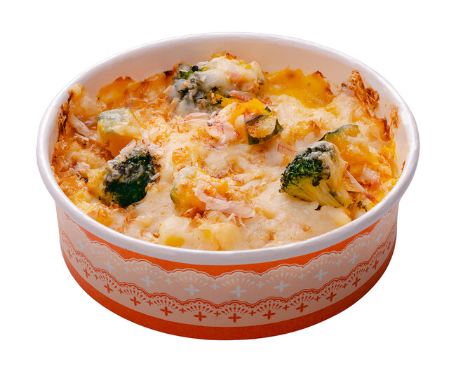 北海道産のかぼちゃをベースに豆腐ハンバーグや野菜、マカロニ、かつお節が入った具沢山の和風グラタンです。