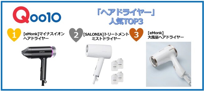 インターネット総合ショッピングモール「Qoo10」を運営するeBay Japan合同会社(本社:東京都港区、代表取締役:グ ジャヒョン)は、夏の紫外線によって髪のダメージが気になるこれからの時期に、毎日のヘアケアに欠かせない「ヘアドライヤー」の販売数TOP3※1を発表いたします。