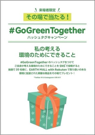「楽天ブース」にて、来場者自身が「環境のためにできること」をTwitterまたはInstagramで「#GoGreenTogether」のハッシュタグを付けて投稿すると、楽天が運営する、サステナブルなお買い物を提案するインターネット・ショッピングモール&オンラインメディア「EARTH MALL with Rakuten」で取り扱う、環境に配慮した商品が抽選で20名にその場で当たるキャンペーンを実施します。