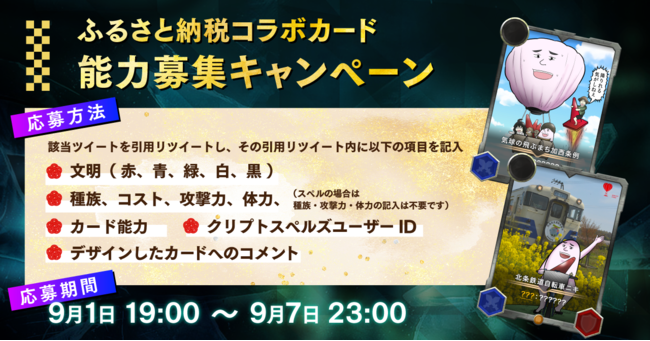 ~ 9月1日 19時00分よりクリプトスペルズ公式Twitterにて能力の公募を開始、9月23日 10時00分よりふるさと納税総合サイト「ふるさとチョイス」を通じて提供予定~