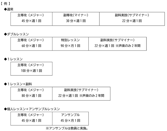 ピアノ演奏家コース、管楽コース、弦楽コース、打楽コース、声楽コース、作曲・音楽クリエイションコース