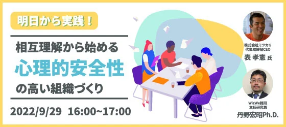 今回のセミナーでは、WizWe総研 主任研究員 丹野宏昭Ph.D.より、「心理的安全性」について心理学的知見を交えてご説明いたします。そして、株式会社ミツカリ 代表取締役CEO 表 孝憲 氏からは、すぐに職場で活用できる、相互理解を深め心理的安全性の高い組織をつくるためのポイントをご紹介いただきます。