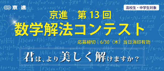 数学は、ひとつの解答を導き出す解法が無限にあり、シンプルで無駄のない解答は芸術のような美しさを持っています。京進では、大学入試とは一味違うオリジナルの数学の問題に挑戦し、解答の正しさだけでなく解法の美しさと華麗さを競い合う経験を通じて、受験を勝ち抜くためだけの勉強でなく、「数学の問題を解くのが好き」という学生たちの純粋な興味や関心を大切に育てることを、本コンテストの目的のひとつにしています。