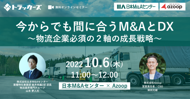 トラック保有企業のための業務効率化プラットフォーム「トラッカーズ」(https://market.trck.jp/)を運営する株式会社Azoop(アズープ、本社:東京都港区、代表取締役:朴 貴頌、以下:Azoop)は10月6日(木)に、株式会社日本M&Aセンター 山本 夢人 氏をお迎えし「今からでも間に合うM&AとDX~物流企業必須の2軸の成長戦略~」を開催することをお知らせいたします。