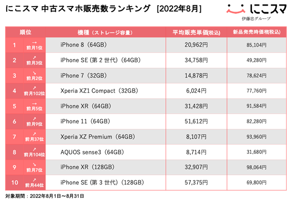 にこスマ|2022年 8月中古スマホ販売数ランキング