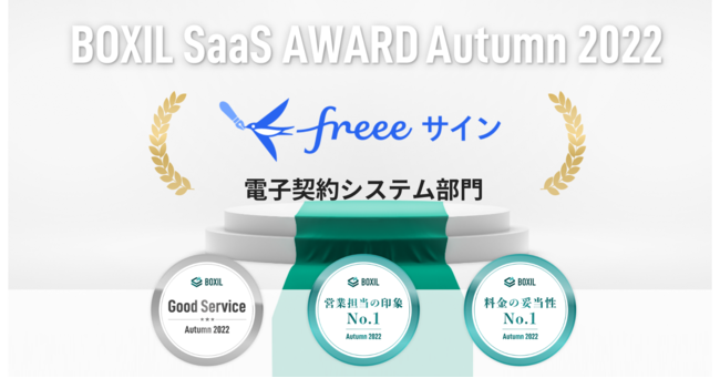 freee株式会社(本社:東京都品川区、CEO:佐々木大輔)のグループ会社であるfreeeサイン株式会社(本社:東京都品川区、代表取締役:鬼頭 政人)が提供する電子契約サービス「freeeサイン」は、2021年7月1日から2022年6月30日までの1年間で最も評価されたSaaSを表彰する「BOXIL SaaS AWARD Autumn 2022」において、電子契約システム部門 「Good Service」・「営業担当の印象No.1」・「料金の妥当性No.1」の3つを受賞したことをお知らせします。