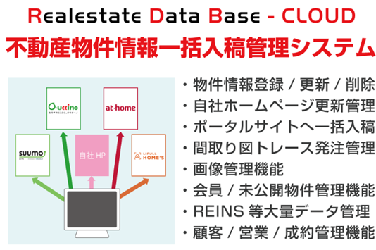 不動産(仲介・分譲)会社向けのASPサービス(物件情報管理・不動産ポータルサイトへのデータ入稿・自社HP管理機能・顧客管理・業績管理・契約者管理等の機能をもつクラウドサービス)で、不動産仲介業者の販促、業務管理を広範囲に支援するツールです。